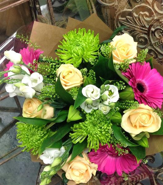 Lovely mix of fresh flowers, including roses, lisianthus, gerberas and green blooms.