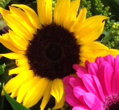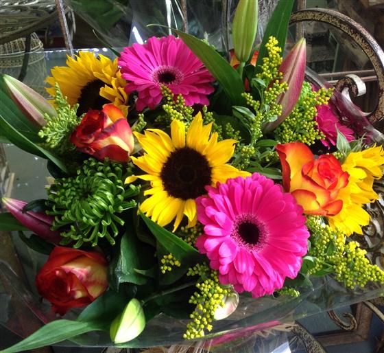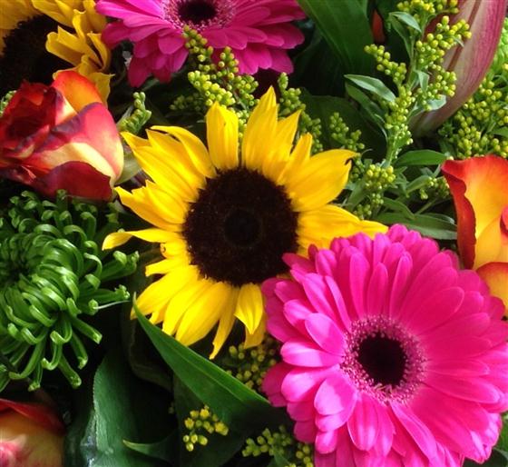 Vibrant and cheerful bouquet with roses, sunflowers, gerberas and green blooms.