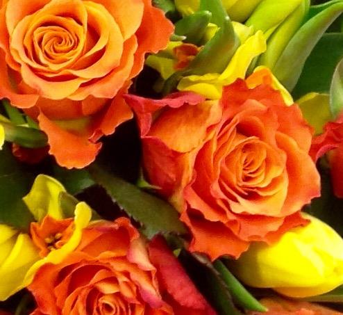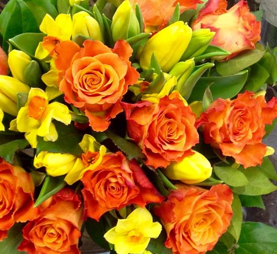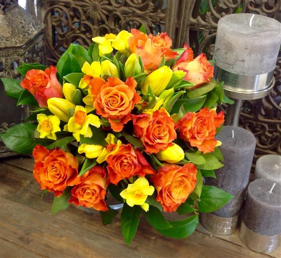 Bright and cheerful sunny spring flowers with orange roses.