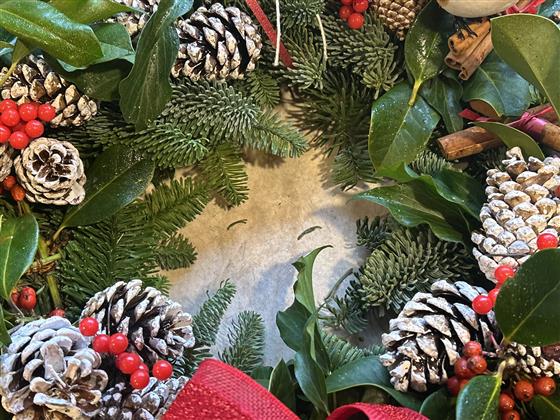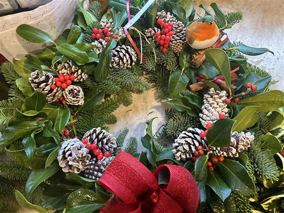 traditional door wreath spruce holly cones and berries with a bow of your choice, robin included too