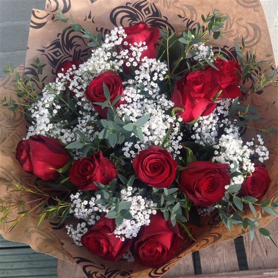 12 short stemmed red roses with gypsophila and foliage or the option of 18