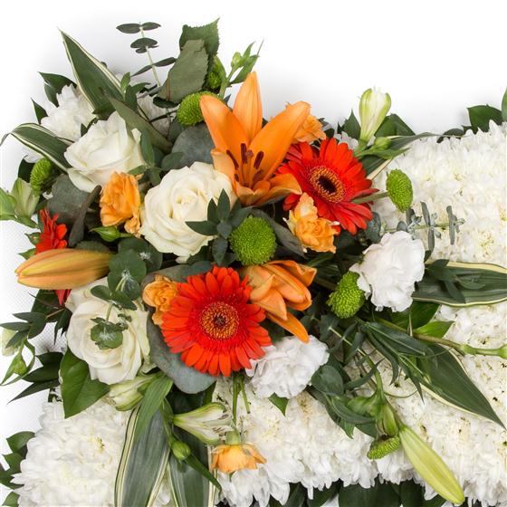 The traditional tribute is created using a white chrysanthemum base and a spray of flowers as pictured or in your choice of colours. Choose between a foliage or ribbon surround.