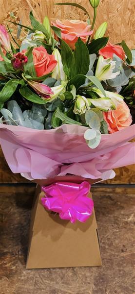 lovely miss piggy roses, lillies and alstromaeria