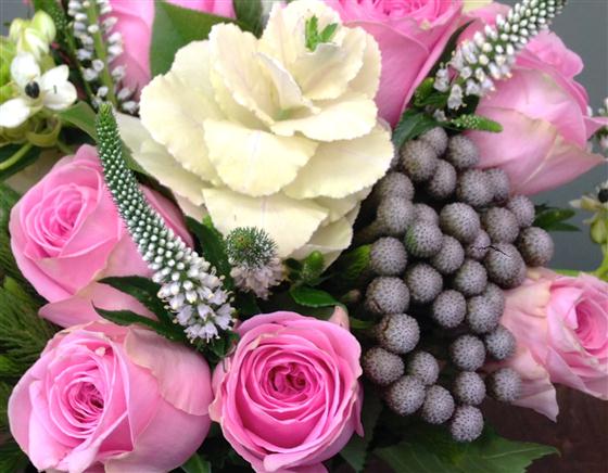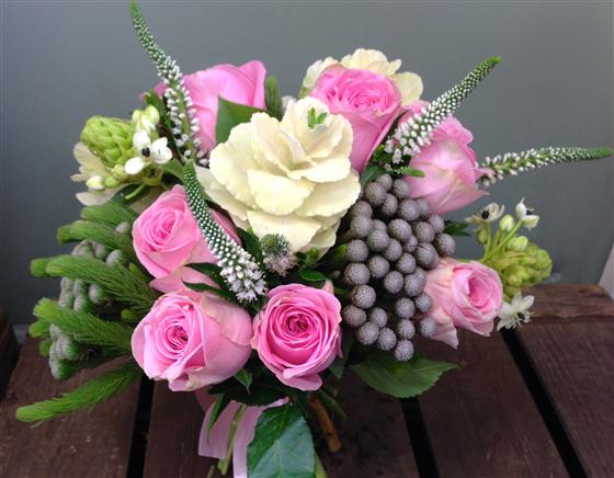 A stylish combination of pink roses and carefully selected seasonal blooms combine to create a soft, elegant feel.