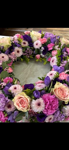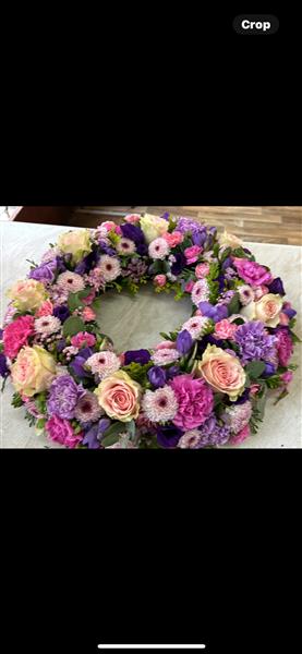 beautiful wreath, selection of different shades of pinks, lilacs and purples with a touch of white