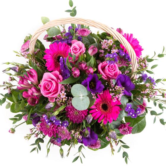A colourful arrangement of cerise pinks and purples, including roses, mini gerberas, alstromeria and dainty wax flower.