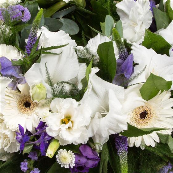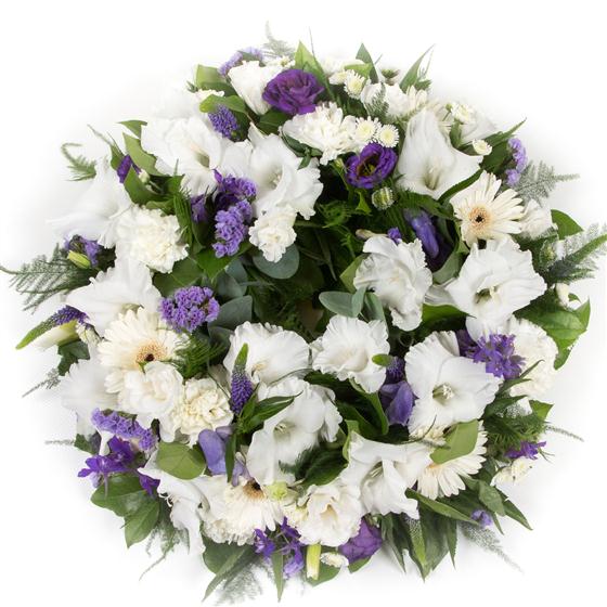 Crisp whites, lilacs and purples are with mixed seasonal foliage to make this traditional, elegant wreath.