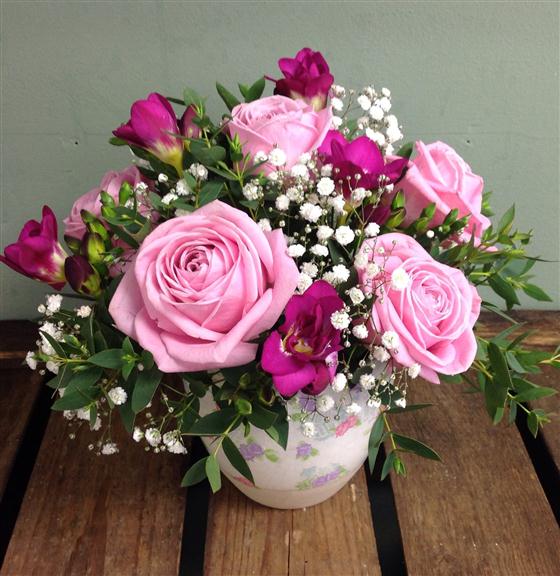 Pink roses and cerise freesias in an white pot elegantly decorated with pink & lilac blooms & foliage