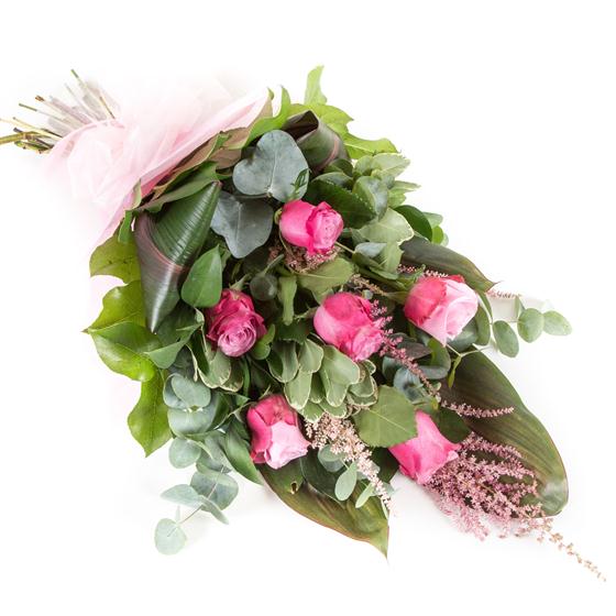A simple tied spray of 6 roses in your choice of pink, red, white or yellow. Choose either 6 roses as pictured or 12.